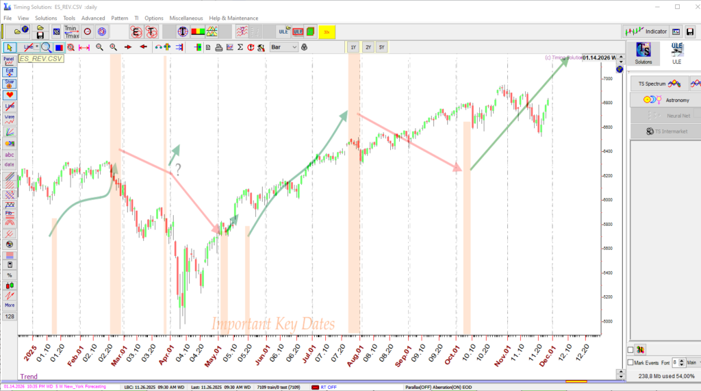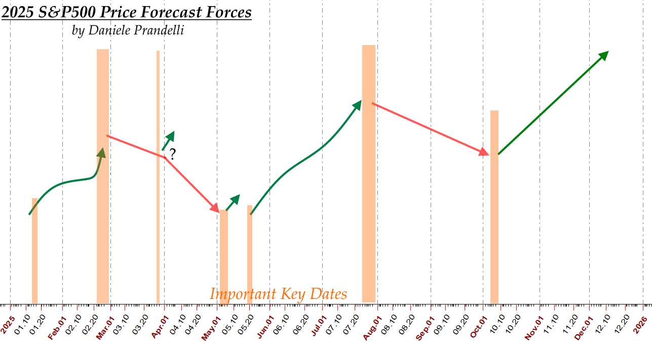 One year in advance, in December 2024, I published my 2025 S&P500 Annual Bulletin. In my Bulletin, you can find the chart I call “Annual Forecast Forces.” It sums up what I believe will be the annual market’s favourite behaviour. You also see that I provide potential Key Dates when the market may make a decision, which could signal a trend change or a new breakout acceleration.